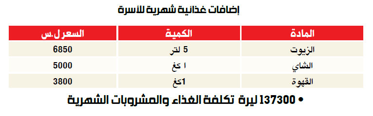 لم تشهد المكونات الأخرى ارتفاعات مباشرة خلال الأشهر الثلاثة الماضية، فاستقر النقل عند تكلفة 21600 ليرة شهرياً، والألبسة عند 17700 ليرة شهرياً للأسرة، وكذلك التعليم 18600 ليرة، والصحة عند تكلفة تقديرية شهرية 11 ألف ليرة، وكذلك الاتصالات 11 ألف ليرة.