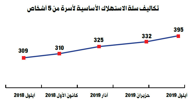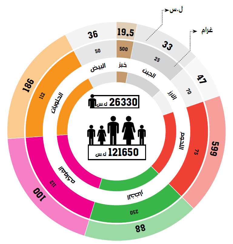 لتشكل تكلفة مكونات السلة الأساسية الثمانية: 330700 ليرة شهرياً، تشكل نسبة 92% من مجموع تكاليف المعيشة بعد إضافة هامش 8% تقديرياً للحاجات الأخرى الطارئة. ما يوصل تكاليف المعيشة الشهرية إلى 359 ألف ليرة شهرياً لأسرة من خمسة أشخاص في دمشق نهاية شهر أيلول 2019.