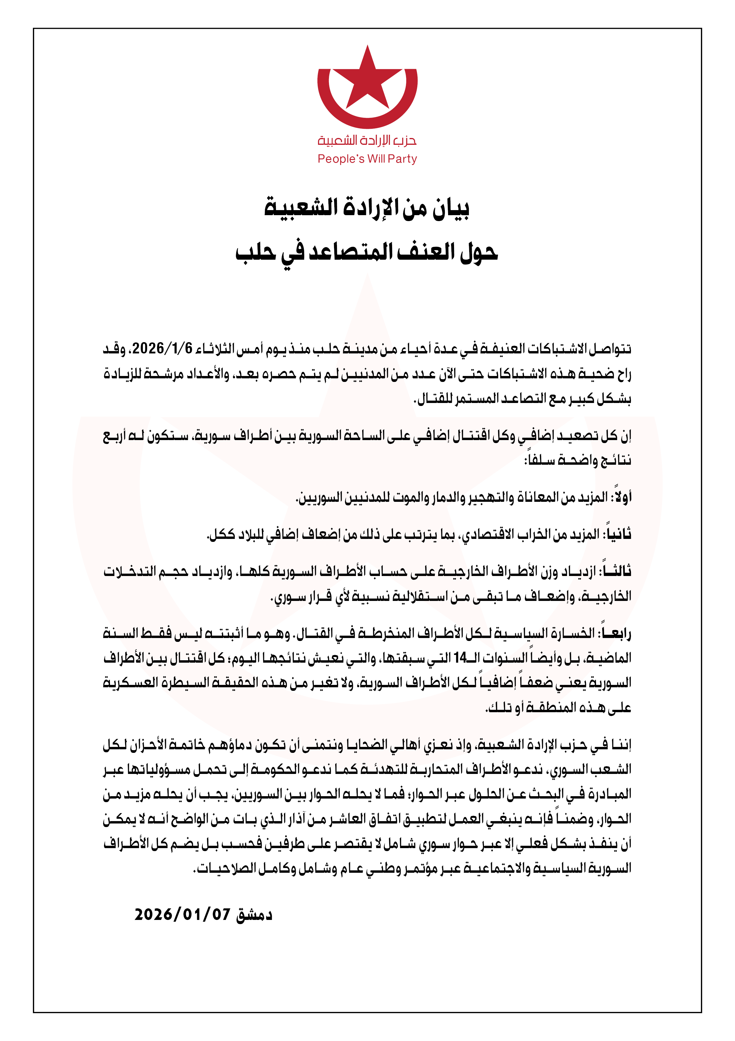 بيان من الإرادة الشعبية حول العنف المتصاعد في حلب