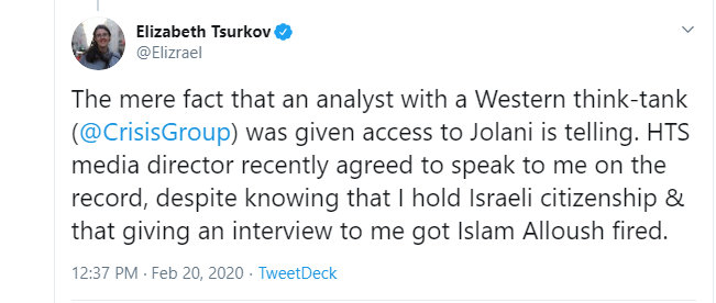 It is no coincidence that earlier this month (February 10), Foreign Policy magazine published an article on Idlib by an “Israeli” writer, Elizabeth Tsurkov. The article included a statement that Tsurkov obtained from Taqi al-Din Omar, HTS’s director of media relations. Tsurkov herself revealed in a tweet on her official account on Twitter that Omar agreed to give her the statement despite knowing that she holds Israeli citizenship – in this context, we cannot forget the “Israeli” admissions of treating in its hospitals up to 1,400 wounded al-Nusra fighters and sending them to fight again in southern Syria.