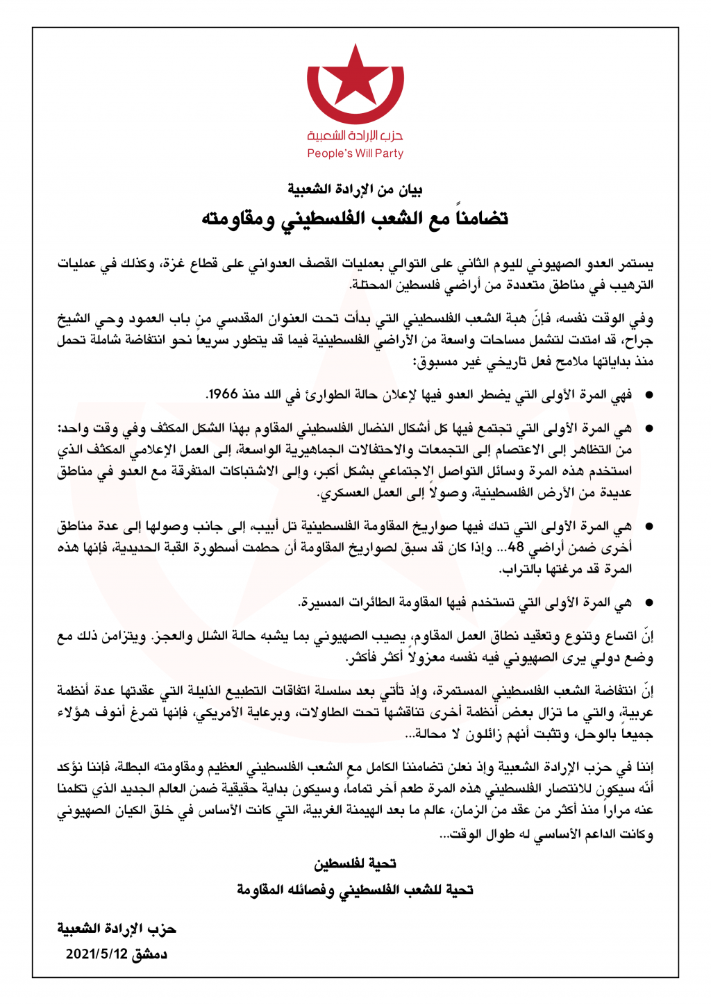 إننا في حزب الإرادة الشعبية وإذ نعلن تضامننا الكامل مع الشعب الفلسطيني العظيم ومقاومته البطلة، فإننا نؤكد أنّه سيكون للانتصار الفلسطيني هذه المرة طعم آخر تماماً، وسيكون بداية حقيقية ضمن العالم الجديد الذي تكلمنا عنه مراراً منذ أكثر من عقد من الزمان، عالم ما بعد الهيمنة الغربية، التي كانت الأساس في خلق الكيان الصهيوني وكانت الداعم الأساسي له طوال الوقت...